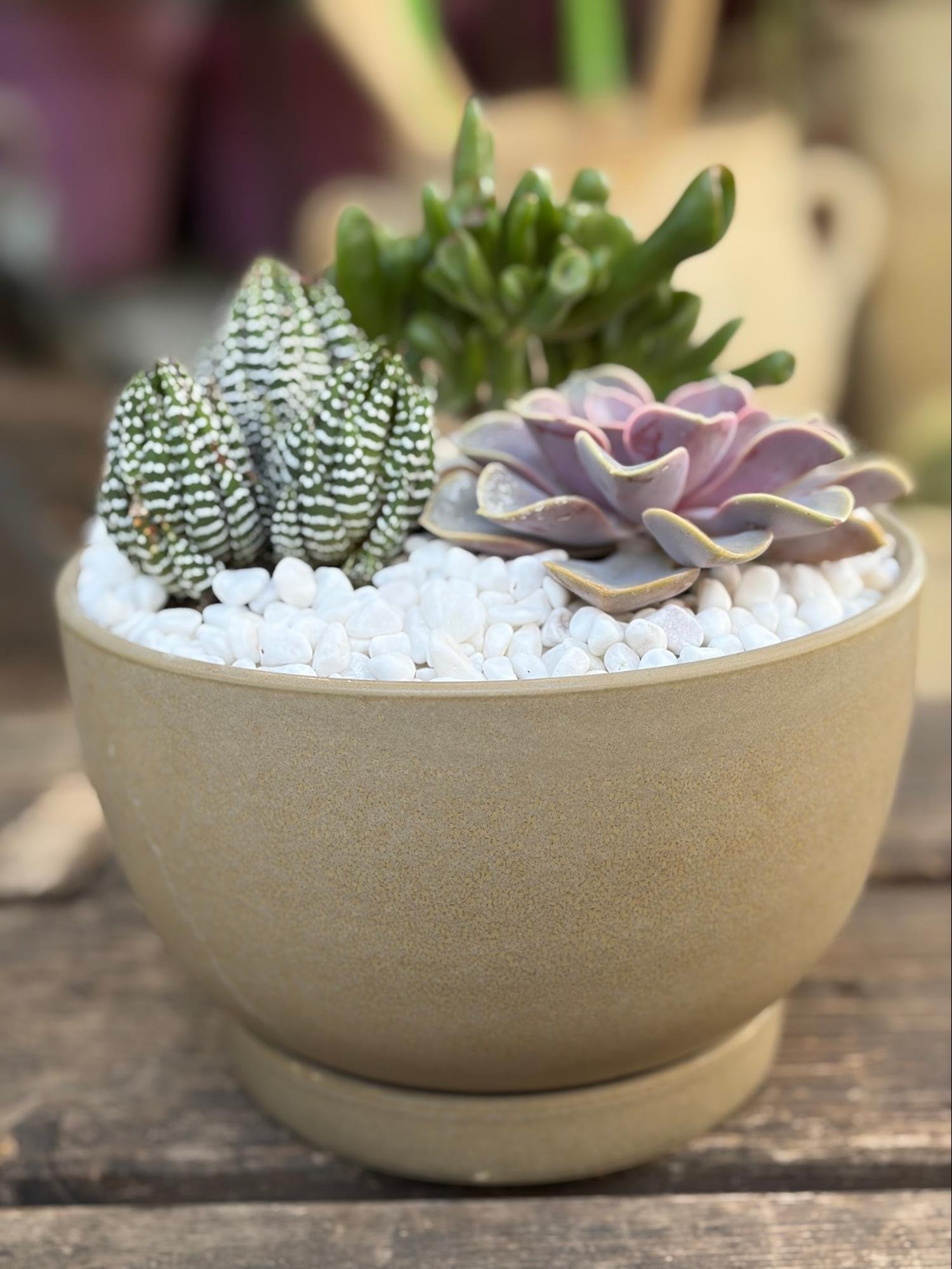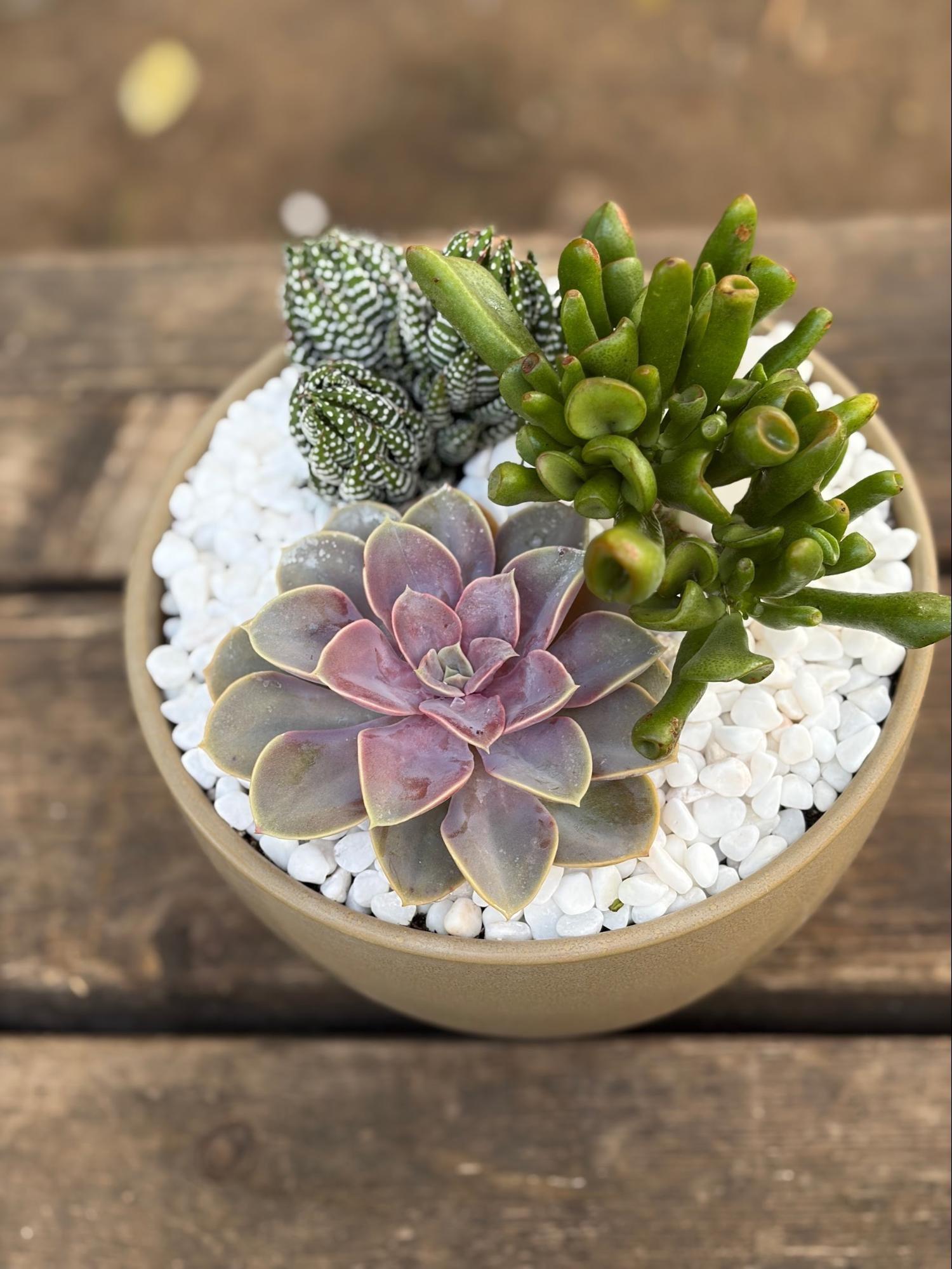 סידור מעוצב הכולל שלושה סוקולנטים מסוגים שונים, שתולים במקצועיות ליצירת מראה טבעי, נקי וקל לתחזוקה.